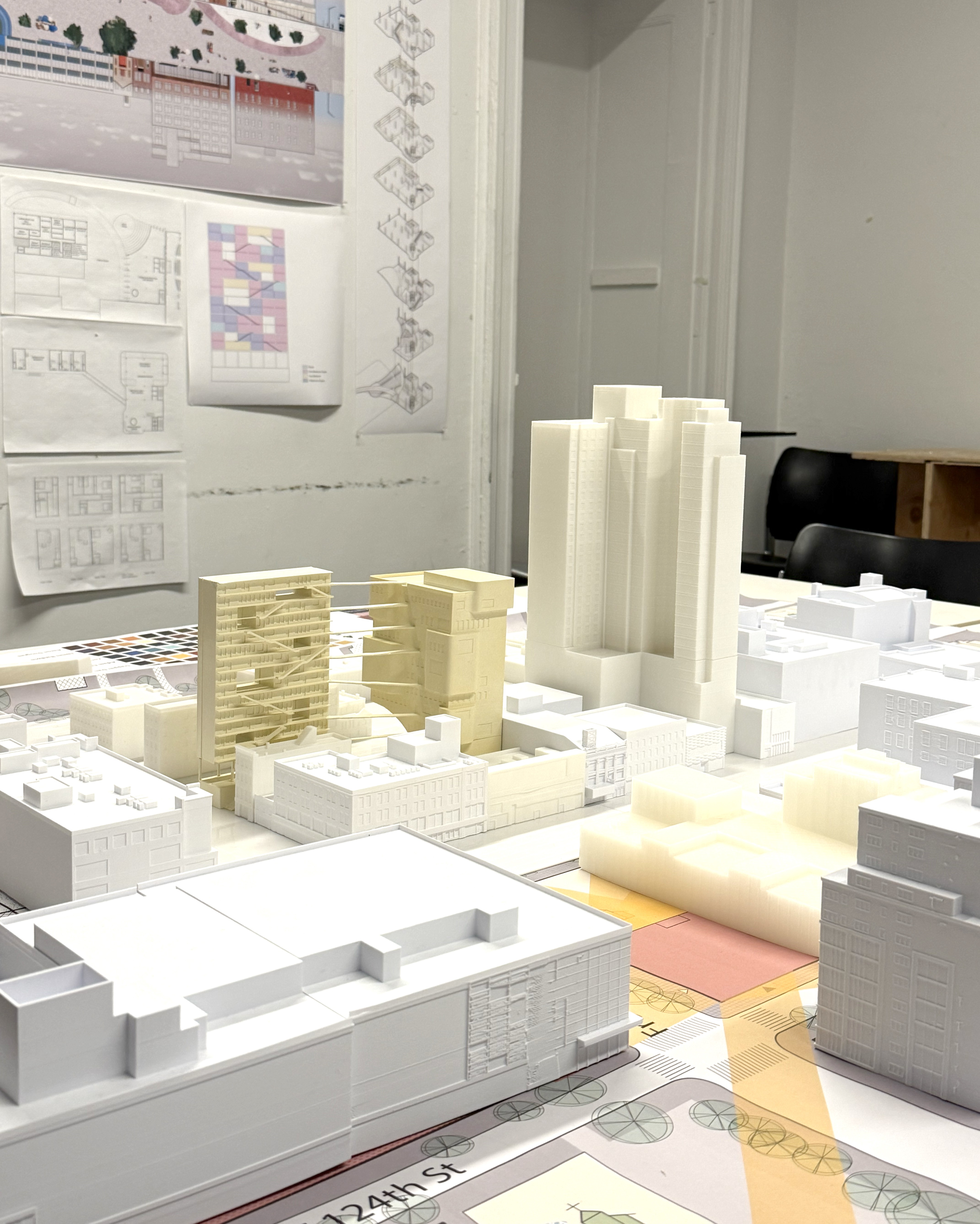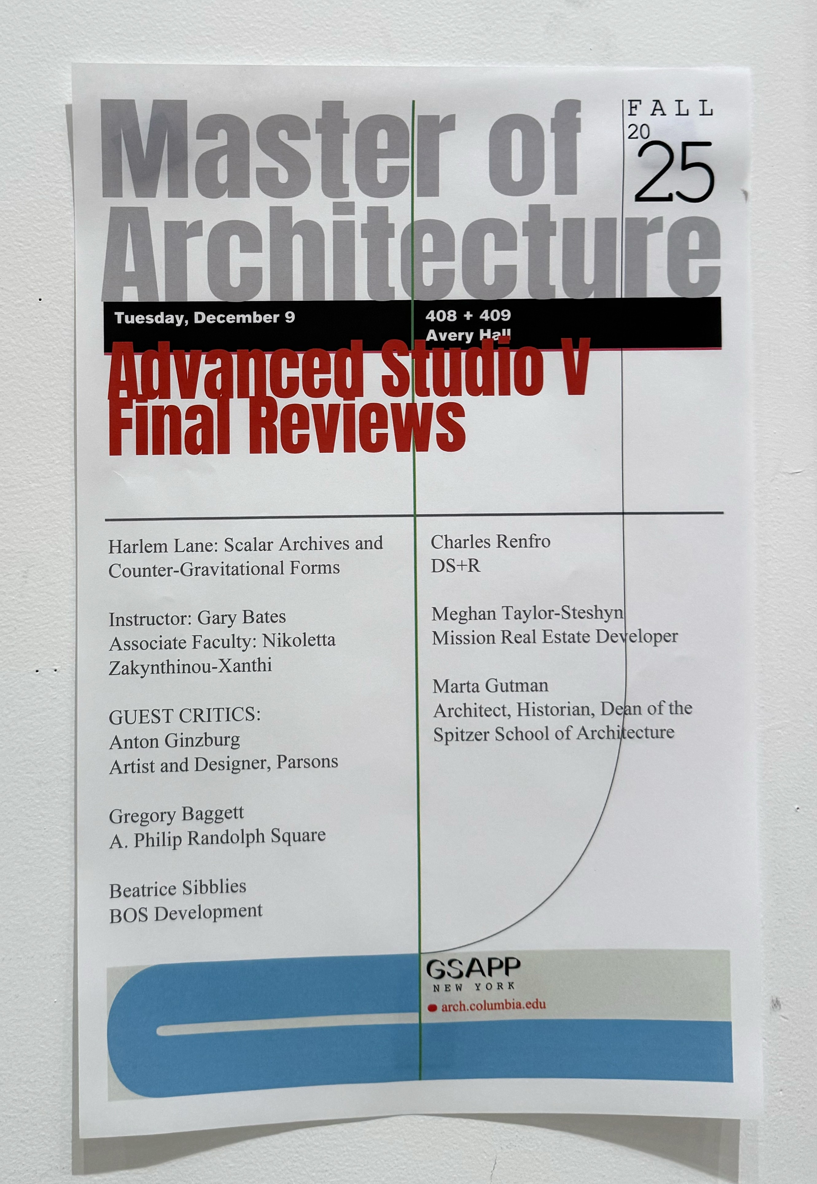 I served as guest critic for the final graduate review at Columbia University's Graduate School of Architecture, Planning and Preservation (GSAPP). The studio, led by Gary Bates with associate faculty Nikoletta Zakynthinou-Xanthi, explored the theme of "Harlem Lane: Scalar Archives and Counter-gravitational Forms." I was joined by fellow critics Gregory Baggett, Beatrice Sibbles, Charles Renfro, Meghan Taylor-Steshyn, and Marta Gutman in reviewing the students' final projects.