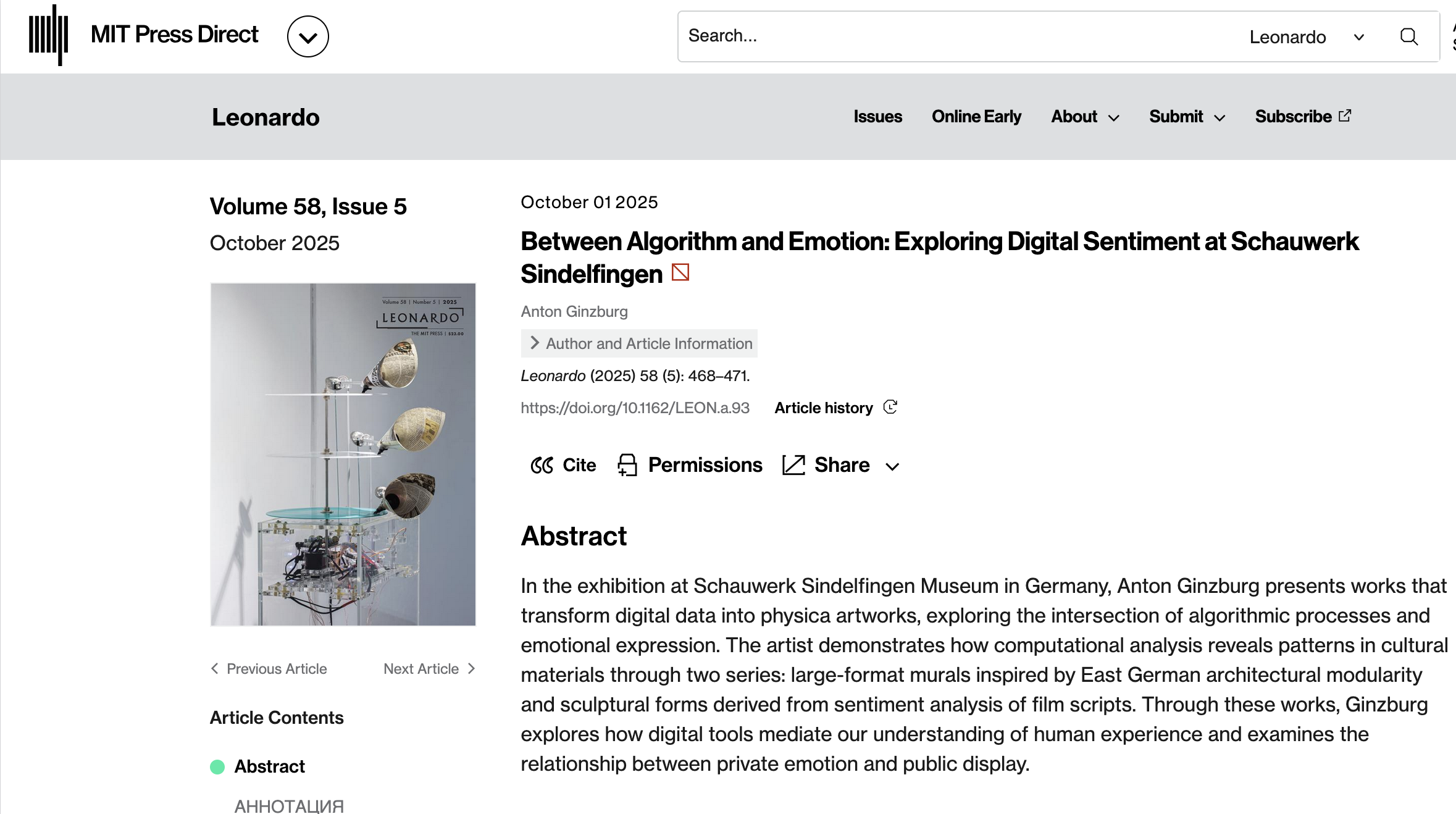 In the exhibition at Schauwerk Sindelfingen Museum in Germany, Anton Ginzburg presents works that transform digital data into physical artworks, exploring the intersection of algorithmic processes and emotional expression. The artist demonstrates how computational analysis reveals patterns in cultural materials through two series: large-format murals inspired by East German architectural modularity and sculptural forms derived from sentiment analysis of film scripts. Through these works, Ginzburg explores how digital tools mediate our understanding of human experience and examines the relationship between private emotion and public display.